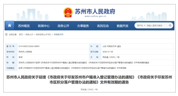 近日,苏州市人民政府关于延续《市政府关于印发苏州市户籍准入登记管理办法的通知》《市政府关于印发苏州市区积分落户管理办法的通知》文件有效期的通告发布。